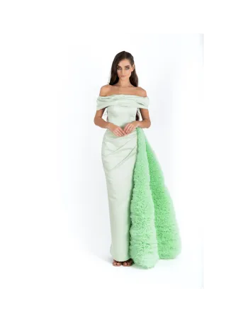 Mint Satin Gown with Tulle Sheering Skirt Cape