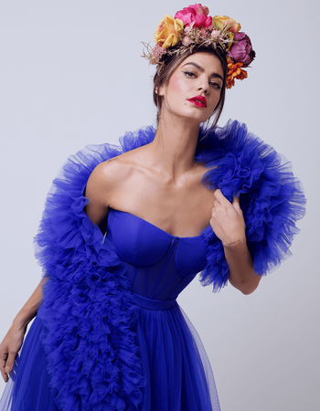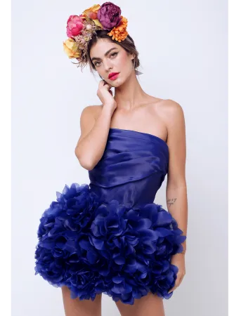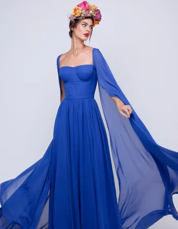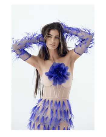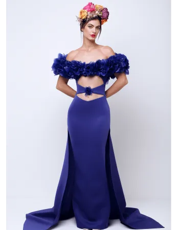 Off Shoulder Organza Flower Sleeve Dress with Peekaboo Waist and Long Tail